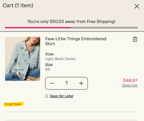 Any item that is Final Sale will be listed as such below the price for the item with the phrase "Final Sale" (see example below). In addition, the price of all items that are Final Sale end in $.97.